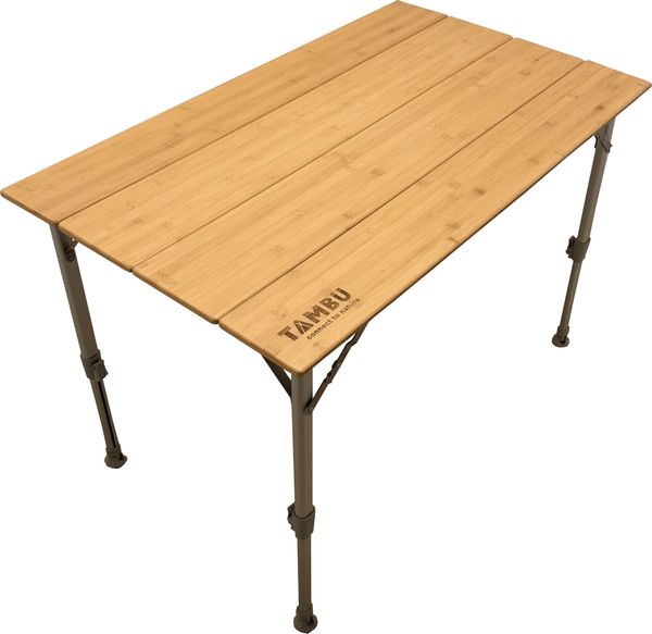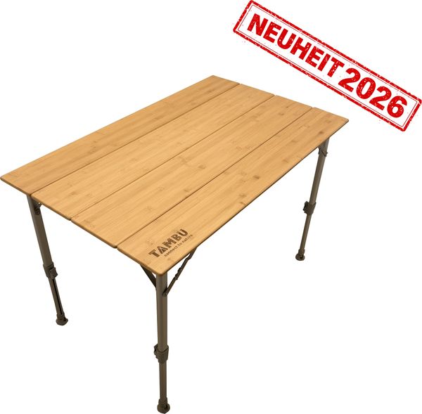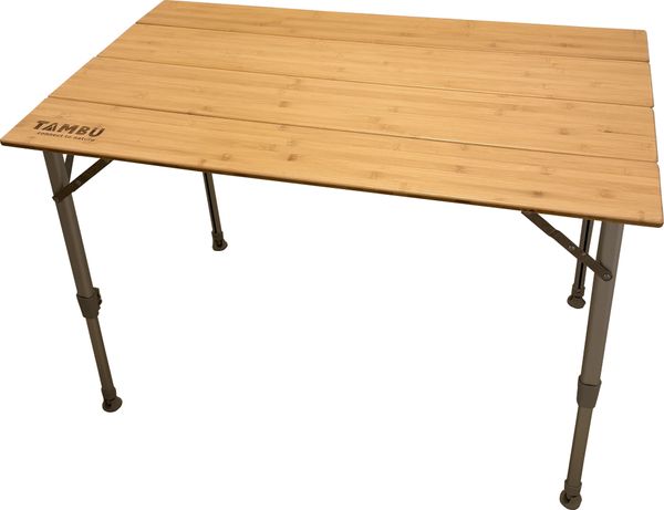 "The Bista camping table from Tambu is the ideal companion for anyone who wants to take their outdoorexperiences to the next level. Whether camping, vanlife or simply enjoying a relaxing day outdoors, this table offers the perfect blend of functionality and style. With a generous table surface area of approx. 100 u00d7 60 cm and a height-adjustable construction between 47 and 65 cm, the Bista adapts flexibly to any situation. The robust aluminum legs with push button system allow for easy adjustment, while the sturdy bamboo table top not only offers a natural look, but also high stability."