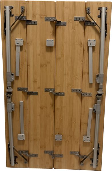 - "Bamboo table top, aluminum frame, polyester carrying bag"