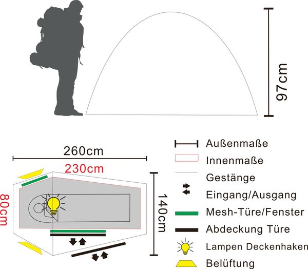 "The CHOTA 1 from TAMBU is the ideal 1persontrekking tent for adventurers who value lightness, weather protection and comfort. Whether for hiking, cycling, camping or motorsportsu2013 this tent is the perfect companion for minimalist tours and soloadventures. The streamlined design reduces the attack surface in windy conditions and ensures less weight. Thanks to the external frame, the tent can be pitched quickly even in the rain, while the side entrance provides easy access."