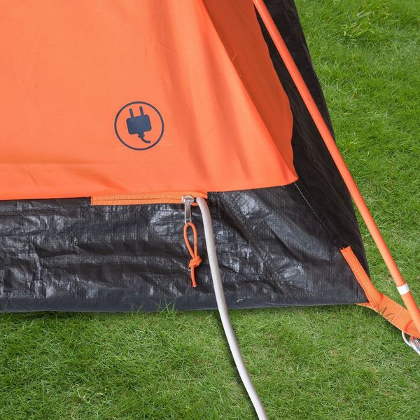 "Inside, the tent with dimensions of approx. 210 u00d7 180 u00d7 120 cm offers enough space for three peopleu00f. Practical pockets and a lampceiling hook keep things tidy and provide lighting, while a cable feed-through makes it easier to connect power sources. Ventilation is supported by two protected openings in the roof area, which ensure fresh air and reduced condensation even when it rains."