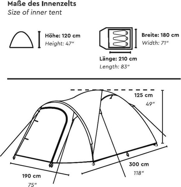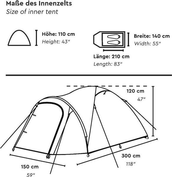 "The outdoor tent of the HAIKA 3 measures approx. 300 u00d7 190 u00d7 125 cm and not only offers enough space for sleeping, but also a spacious vestibule with a separate groundsheetu00d7. This area is ideal for keeping shoes, rucksacks and other equipment dry and clean. The entrance door can be fully rolled up to the side, which ensures convenient access and excellent ventilation."