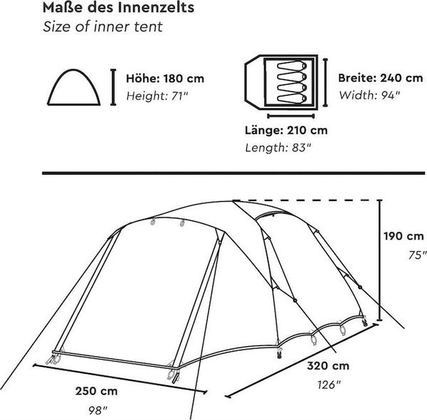 "The sleeping cabin measures approx. 240 u00d7 210 u00d7 180 cm and not only offers plenty of space, but also a comfortable freedom of movement thanks to the dome construction and the high inner heightu00f6he. Permanent ventilation openings, meshelements in the inner tent and a lampceiling hook increase comfort and make the HENA 4 particularly suitable for everyday use. Despite its size, the tent remains lightweight with a weight of approx. 6.0 kg and a pack size of approx. 64 u00d7 22 u00d7 22 cm, it is easy to transport."