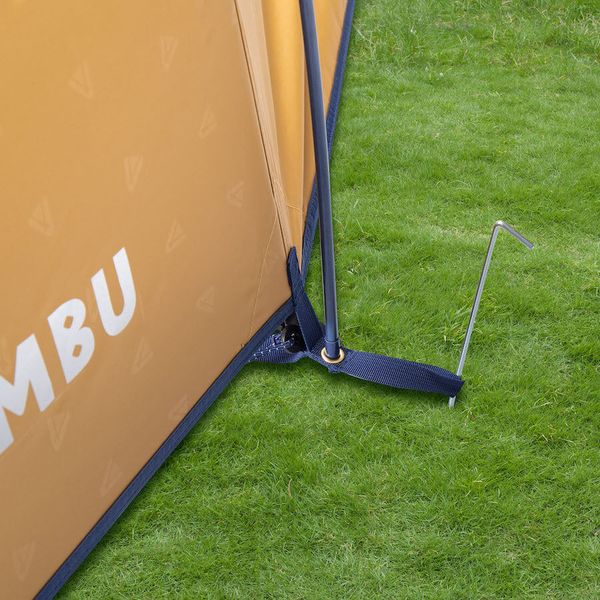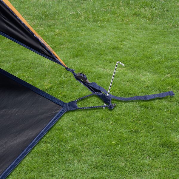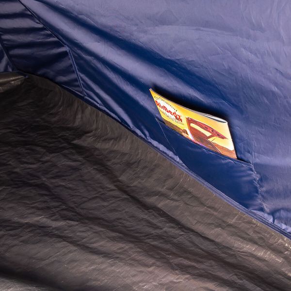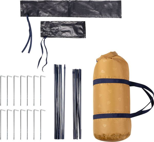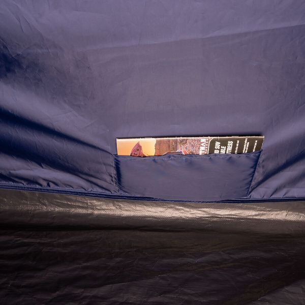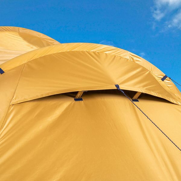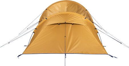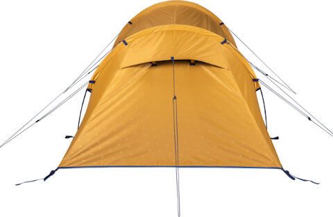 - "Double-roof tunnel tent with extra dark sleeping cabin Fiberglass poles Integrated mesh fabric in the inner and outer tent 2 permanent vents with spacers at the front 1 permanent vent with tensioning function at the rear Separate groundsheet for the entrance/stay area Inner pockets Lamp holder"