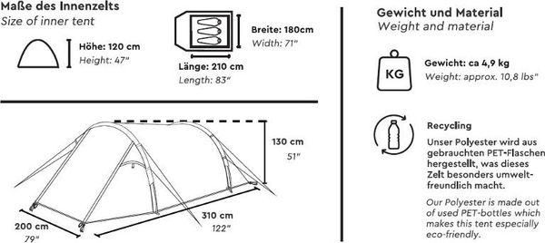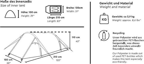 "The Kalo 3 impresses with its sustainable materials, as both the outer and inner tent are made from recycled polyester obtained from used PETbottles. All materials are PFC-free, making the tent an environmentally friendly choice. The wateru00e4ule of 3,000 mm and the waterproof seam tape seal provide reliable protection against rain and moisture, while the robust fiberglass frame ensures stability and easy pitching."