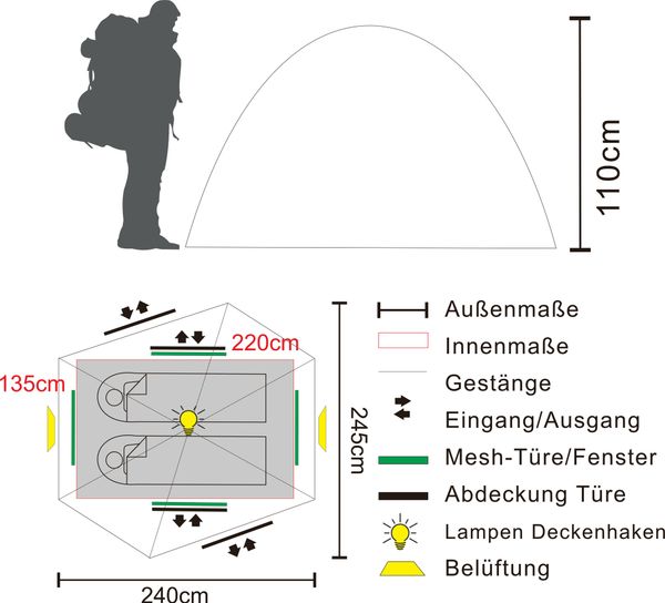 "With dimensions of 220 u00d7 135 u00d7 100 cm, the interior of the Kamalo 2 offers enough space for two people and their trekking equipmentu00fcstung. Two side entrances allow flexible access and improve ventilation inside the tent. A partially integrated groundsheet in the entrance area provides a clean storage area for shoes and wet clothing, while large mosquito nets and integrated ventilation openings ensure pleasant air circulation."