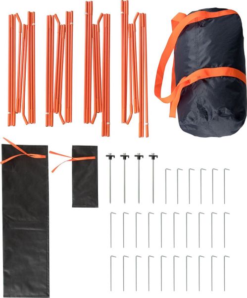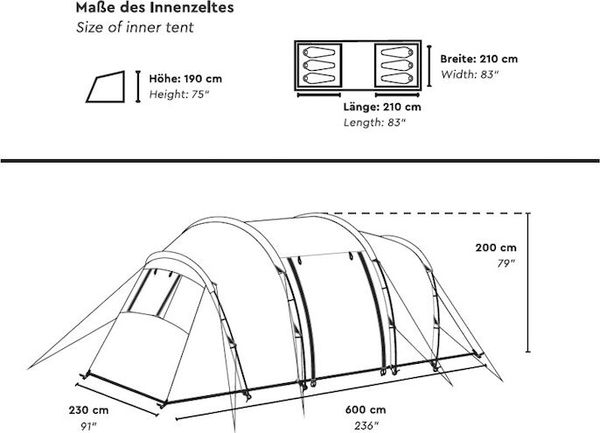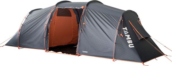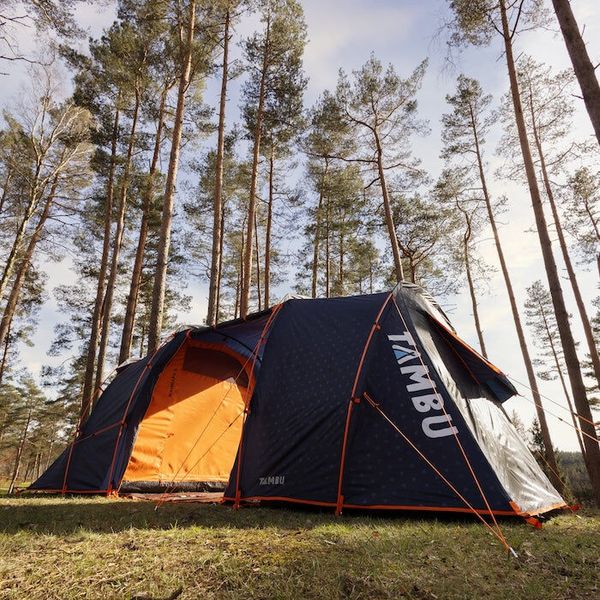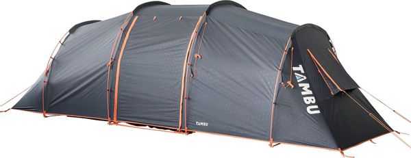 "Sustainability is a top priority at TAMBU. The outdoor tent, the inner tents and the stuff sack are made from 100% recycled rPETpolyester, obtained from PETbottles. The robust outer tent with a water column of 2,000 mm, the sturdy fiberglass poles and reflective guy ropes offer reliable stability in changing weather conditions. Despite its size, the tent is easy to transport with a weight of around 12.9 kg and a pack size of 69 u00d7 27 u00d7 27 cm"