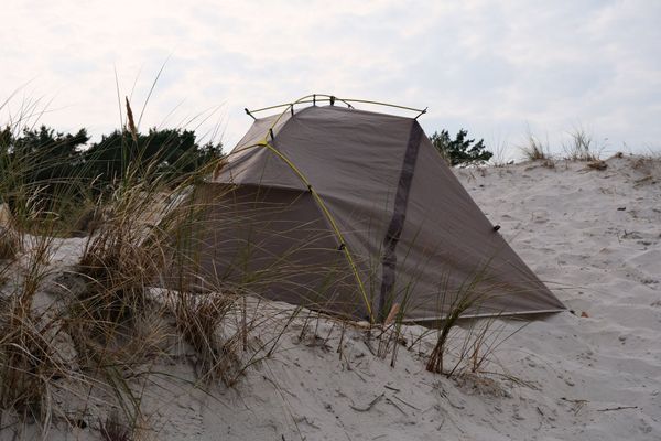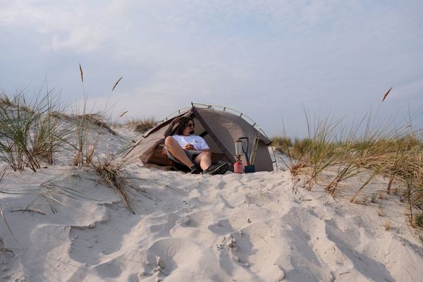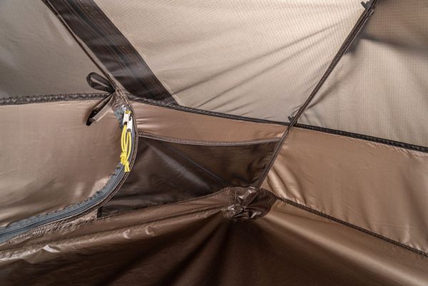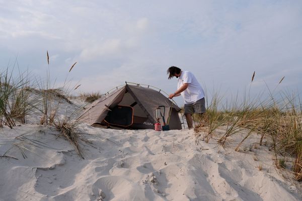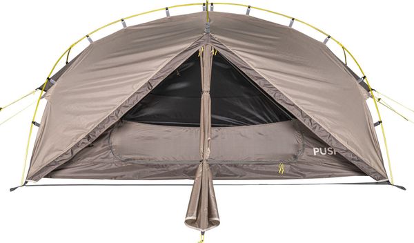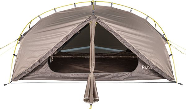 "The outer tent of the PUSPA 2 is made from a robust ripstop material made from recycled polyester and has a PU coating that guarantees a water resistance of 3,000 mm. The tent floor is even more resistant with a water resistance of 5,000 mm, so you stay dry even in the rain. The siliconized coating of the material increases the tear resistance and durability, making the tent a reliable companion on longer tours."