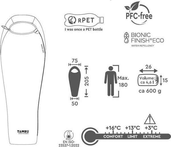 "The Sangu 600 from Tambu is the ideal sleeping bag for anyone who wants to travel light and environmentally conscious in summer. With a weight of only around 600 grams and a compact pack size, it is perfect for trekking, longer tours, traveling and camping. The sleeping bag has been specially developed for warm nights and offers optimum protection and comfort with a comfort range of +16 u00b0C, a limit value of +12.8 u00b0C and an extreme value of +2.9 u00b0C. The dimensions of ca. 205 u00d7 75 u00d7 50 cm make it ideal for people up to a body height of 180 cm."
