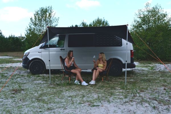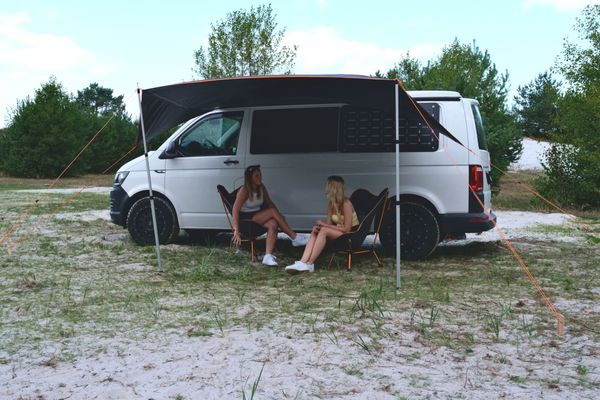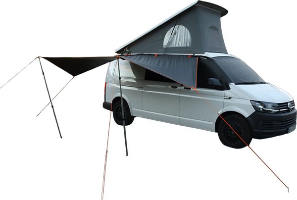 "Flexible awning for campervans that provides shade and protection, easy to install and made from recycled material."