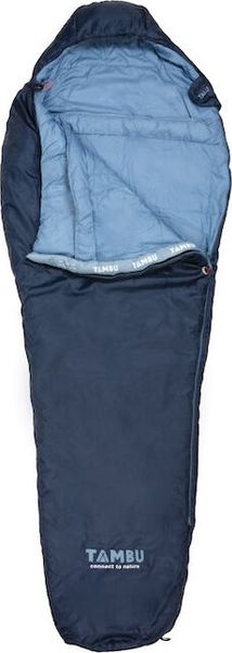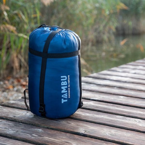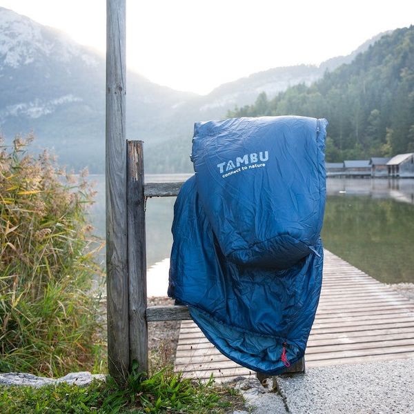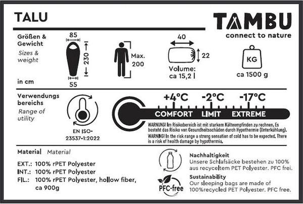 "The TALU 1500 from TAMBU is the perfect companion for cold nights from spring to fall and is ideal for trekking, camping, bike tours or simply for relaxed festival nights. As a 3season sleeping bag, it offers high thermal performance thanks to its sustainable materials and well thought-out details. With a comfort range of ca. +3.7 u00b0C, a limit value of u20131.5 u00b0C and an extreme value of u201317.3 u00b0C, it keeps you pleasantly warm even when the temperature drops. The double-layer microfiber filling made from recycled polyester ensures uniform insulation and reliable heat retention."