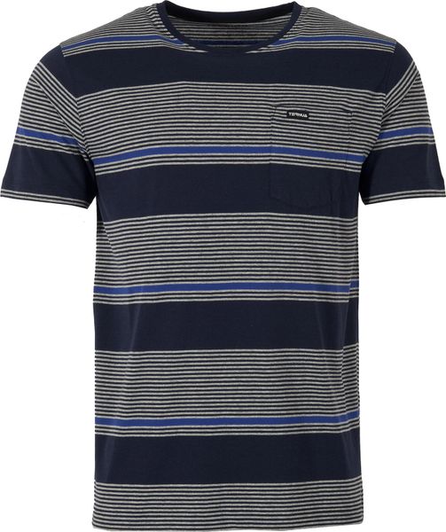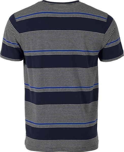 Nachhaltiges, gestreiftes Kurzarm-T-Shirt für Herren in melierter Optik mit Brusttasche. Hergestellt aus nachhaltigem Material, mit einem Stoffgemisch aus Baumwolle und recyceltem Polyester. Leicht und tragefreundlich.