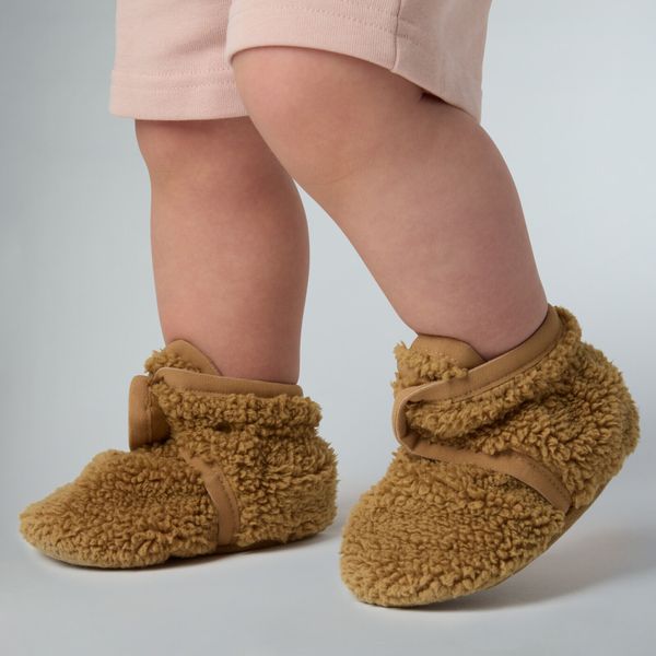 "The hat, also decorated with bear ears and a logo, completes the set perfectly. The mittens are equipped with a clever press stud function that keeps them together when not in use. A paw print on the palms gives them a playful touch. The booties are not only warm, but also practical with a fold-down flap and a non-slip silicone paw print on the underside to prevent slipping."