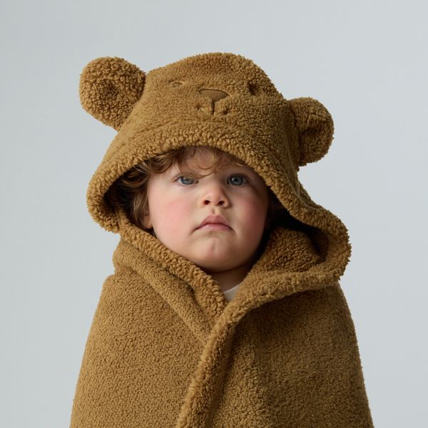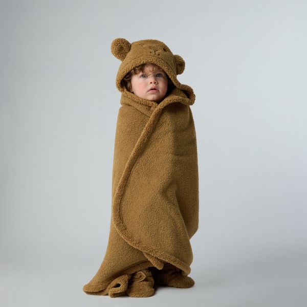 - "The square blanket has a hood with a bear's face and attached ears in one corner, as well as an embroidered logo."