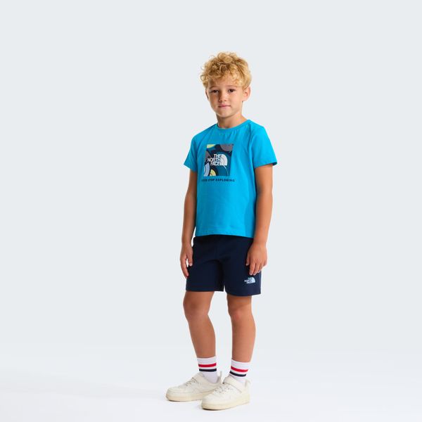 "The T Shirt features a ribbed collar and neck tape for added comfort. A central water-based front graphic gives the shirt a cool look, while the iconic North Face logo can be found on the back of the T-shirt as well as on the front of the shorts. The shorts are equipped with an elastic waistband that fits comfortably around the body and guarantees freedom of movement."