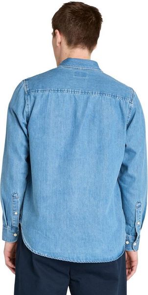 "Stylish men's denim shirt made of cotton and TENCELu2122, ideal for everyday wear and leisure, with embroidered logo and button placket."