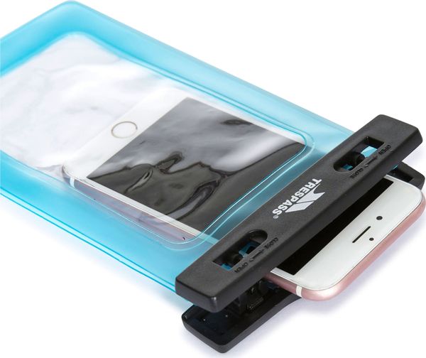"Waterproof phone case with IPX7 protection and secure closure, suitable for most smartphones, ideal for outdoor activities."