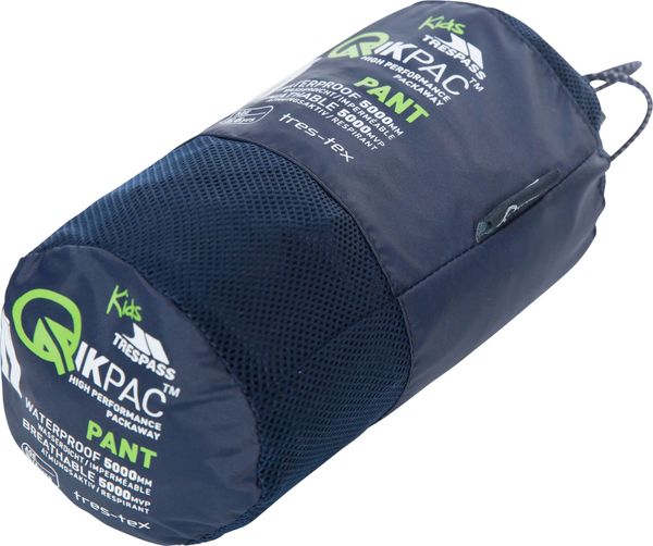 "The Qikpac Pant from Trespass is the perfect choice for kids who love outdoor adventures, whatever the weather. These pants are equipped with a waterproof outer material that offers an impressive waterproof rating of 5000mm. This keeps your child dry and protected even in heavy rain. The welded seams ensure extra durability and prevent water from penetrating, so that the clothing stays dry even in extreme conditions."
