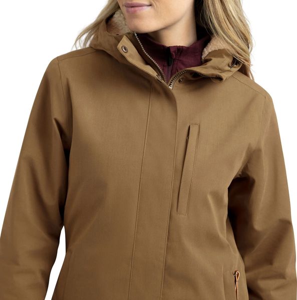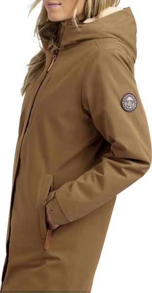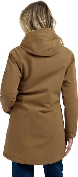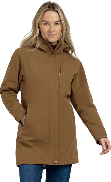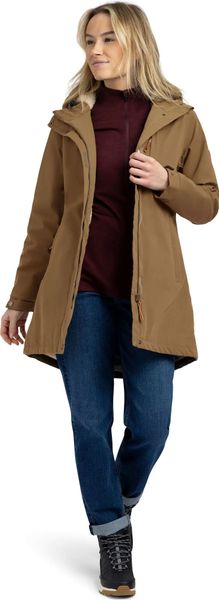 "The adjustable fit ensures optimum comfort: the hood and cuffs can be individually adjusted so that the jacket fits perfectly. Stylish details such as the antique brass trims and curved hem give the jacket a special look. The three zipped pockets offer plenty of space for your essentials, while the longer length of the jacket also protects against wind and weather. With a waterproof rating of 3000mm, the Risha jacket is not only functional, but also makes a stylish statement for any outdoor enthusiast."