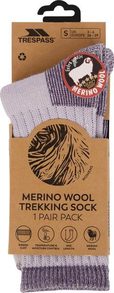 "Experience unparalleled comfort and protection with our premiumwomen's socks designed specifically for hiking and trekking. These mid-length socks from Trespass are the perfect companion for leisure activities, everyday wear and longer tours. Thanks to the sophisticated blend of 80% merino wool and high-performance fibers, they offer luxurious softness to protect your feet during any challenge. The advanced moisture-wicking technology ensures that your feet stay dry and fresh, even during intense activity."