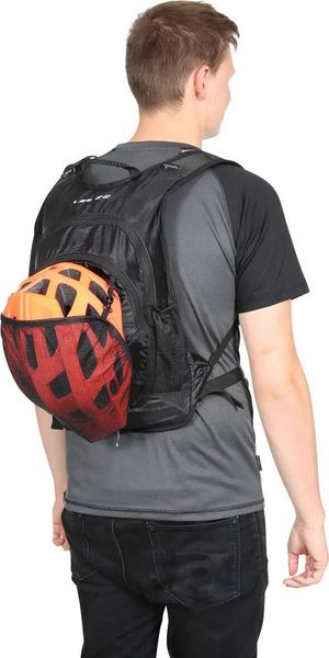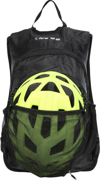 "Lightweight 22L backpack with padded backrest, ideal for cycling and running, including helmet and hydration system."