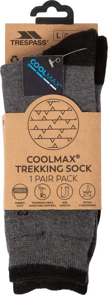 "Experience ultimate comfort and protection on your outdooradventures with the Trespass Wayfarer TrekkingSocks. These lightweight, mid-length socks are perfect for leisure, everyday wear and longer treks. Thanks to the innovative Coolmax technology, moisture is effectively regulated to keep your feet dry and comfortable, while the breathability ensures optimum ventilation."