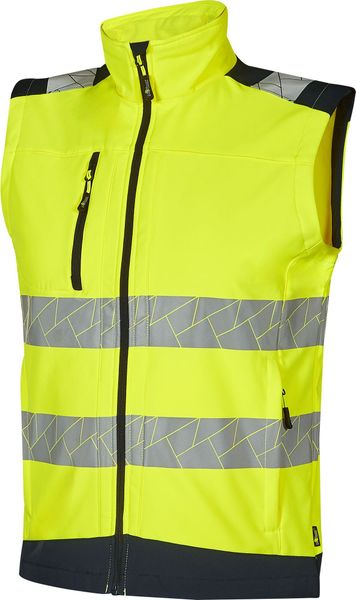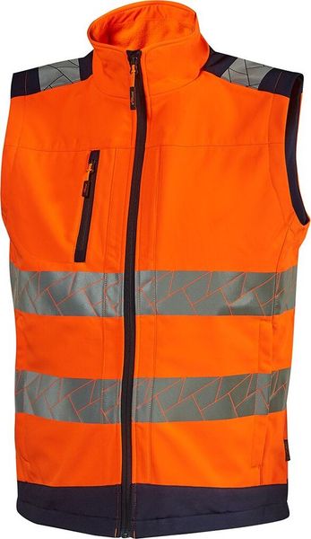 "Comfortable work vest with water-repellent softshell, microfleece lining and reflective strips for visibility and protection."