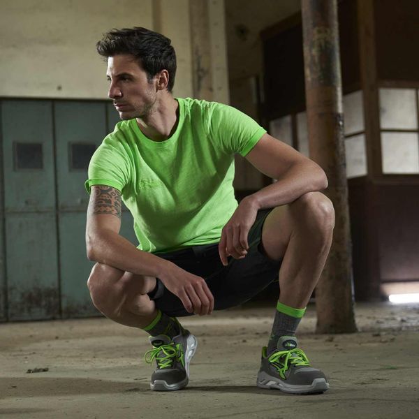 "For your safety, the shoe is equipped with an aluminumprotective toe cap that reliably protects your toes without unnecessarily increasing the weight of the shoe. In addition, the puncture resistance ensures that you don't have to worry about sharp objects on the floor. The slip-resistant PU/PU Infinergy sole offers excellent grip on different surfaces and minimizes the risk of slipping."