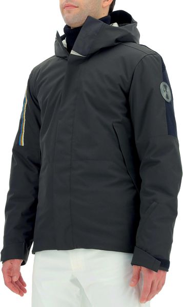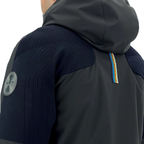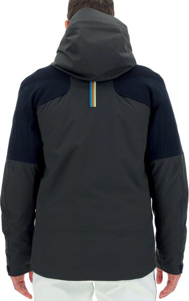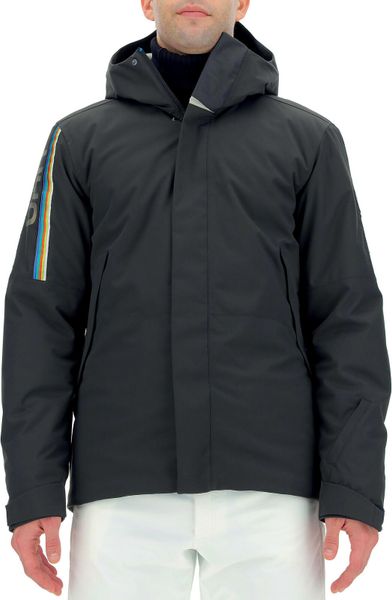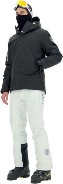- Three-layer stretch fabric with waterproof and breathable Membrain115 - Extra insulated synthetic padding - 3D knitted inserts with Haloflex technology and Membrain115 on the shoulders - Ergomotion sleeve construction for total freedom of movement - Heat-sealed seams for maximum waterproofness - Adjustable hood with drawcord - Waterproof, full-length front zipper, protected by a windproof flap - Adjustable cuffs with Velcro fastener - Two side pockets and a ski pass pocket on the left sleeve with waterproof zipper - Two inside pockets: on the right, a pocket made of elastic fabric with a removable mask cleaning cloth; on the left, a zippered pocket for a smartphone - Built-in snow skirt with elastic, non-slip silicone edge, can be buttoned to the waist. The snow skirt can also be buttoned to the lining so that the jacket can also be worn comfortably when open. - Elastic cord and adjuster at the base of the jacket