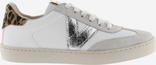 "Discover stylish elegance and sustainability with this unique sneaker that is made in Spain. The women's sneaker combines a sophisticated white leather look with refined suedeelements in a craquelureu00e9look. A metallic "V" from Victoria adorns the side and provides a modern accent". The heel area impresses with an eye-catching animal print that gives the shoe an extra dose of character"
