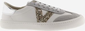 "Made in Spain, these sneakers impress with their white leather-look upper, which is complemented by fanciful and suede elements. The side "V" by Victoria shimmers in sparkling glitter and animal print, while the heel section is in metallic colors. These stylish details make the shoe a real eye-catcher"