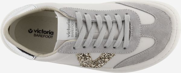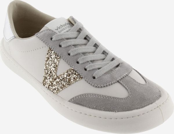 "Made in Spain, these sneakers impress with their white leather-look upper, which is complemented by fanciful and suede elements. The side "V" by Victoria shimmers in sparkling glitter and animal print, while the heel section is in metallic colors. These stylish details make the shoe a real eye-catcher"