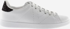 "The "Tenis Piel & Glitter Women" from Victoria are the perfect combination of style and comfort". These white tennis sneakers, which are suitable for both women and girls, are made in Spain from high-quality leather. Their timeless elegance is underlined by the perforated Victoria-u201eVu201c on the side and the glittering heel piece, which adds a touch of glamor to any outfit"