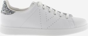 "The "Tenis Piel & Glitter Women" from Victoria are the perfect combination of style and comfort". These white tennis sneakers, which are suitable for both women and girls, are made in Spain from high-quality leather. Their timeless elegance is underlined by the perforated Victoria-u201eVu201c on the side and the glittering heel piece, which adds a touch of glamor to any outfit"