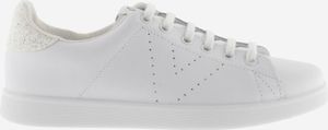 "The "Tenis Piel & Glitter Women" from Victoria are the perfect combination of style and comfort". These white tennis sneakers, which are suitable for both women and girls, are made in Spain from high-quality leather. Their timeless elegance is underlined by the perforated Victoria-u201eVu201c on the side and the glittering heel piece, which adds a touch of glamor to any outfit"