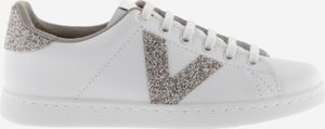 "Experience the perfect mix of style and comfort with the white tennis sneakers for women, made in Spain by the renowned brand Victoria. These sneakers combine high-quality leather with a fashionable victoria-"V" on the side and a stunning heel piece that is accented with glitter and animal print. The metallic label on the tongue gives the shoe an extra touch of elegance"