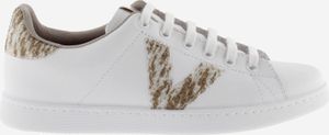 "Experience the perfect mix of style and comfort with the white tennis sneakers for women, made in Spain by the renowned brand Victoria. These sneakers combine high-quality leather with a fashionable victoria-"V" on the side and a stunning heel piece that is accented with glitter and animal print. The metallic label on the tongue gives the shoe an extra touch of elegance"