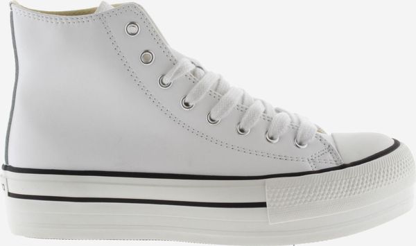"Discover the stylish and vegan Tribu Doble Botu00edn Efecto Piel for women and girls from Victoriau00e4. This high-top platform sneaker impresses with its high-quality leather look and is perfect for anyone looking for a modern yet comfortable shoe. The sneaker features a characteristic victoria patch on the inside and a label on the tongue, giving it a distinctive look"